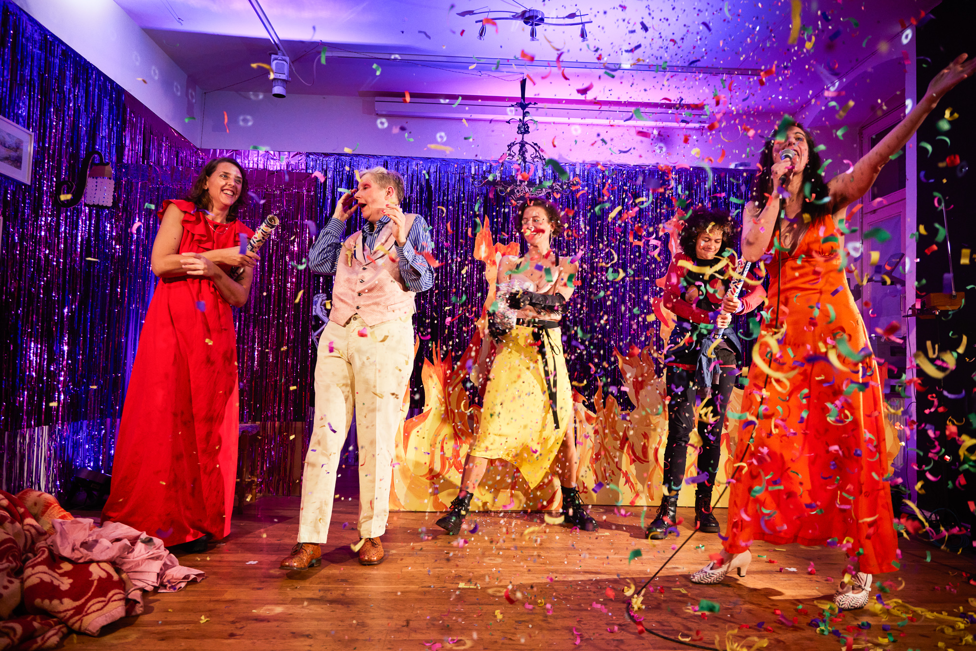 Feuer und Flamme: Antonia Baehr und Lucile Desamory mit Teta Lírica, Florina Speth aka Schloss Mirabell, Carola Caggiano, Wolfgang Müller und Ahmad Hamad, Dj Elke Echo, etc.